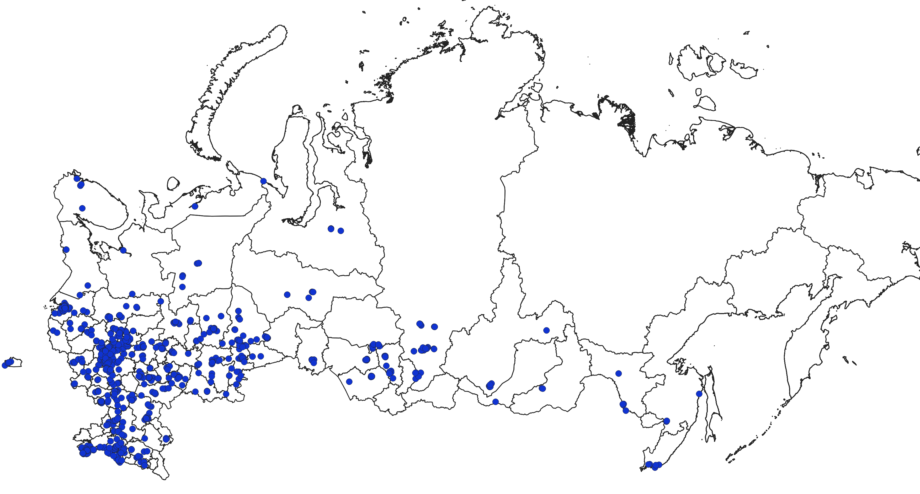 15 ноября 2025 года завершен сбор данных по первому снегу. Всего за один день поступило 1962 наблюдения от 849 участников, и этот результат вновь демонстрирует активность и ответственность нашего сообщества. Благодаря участникам удалось охватить обширную территорию страны и получить ценные полевые данные в сжатые сроки. Мы хотим показать вам схему распределения наблюдений, отражающую географию поступивших данных.