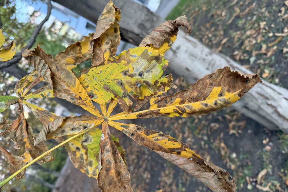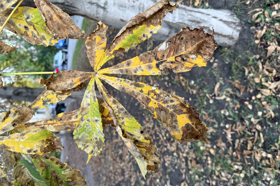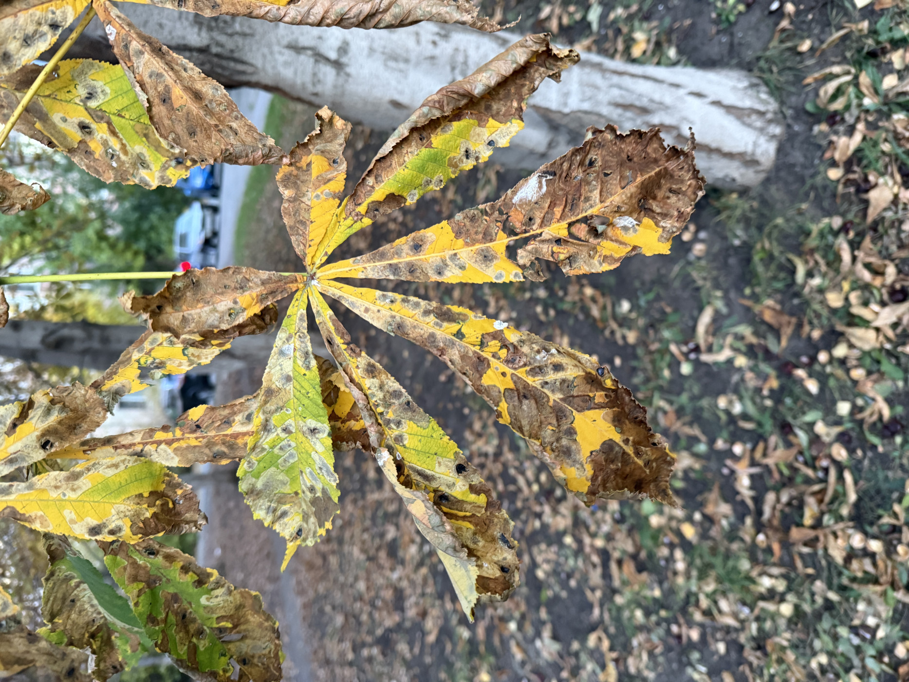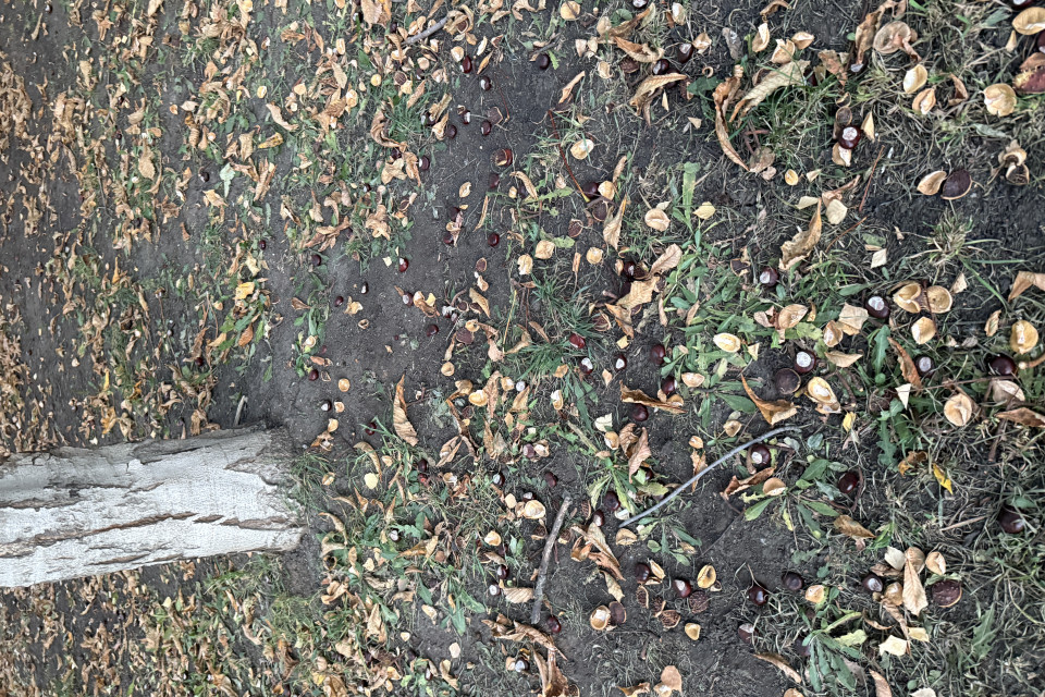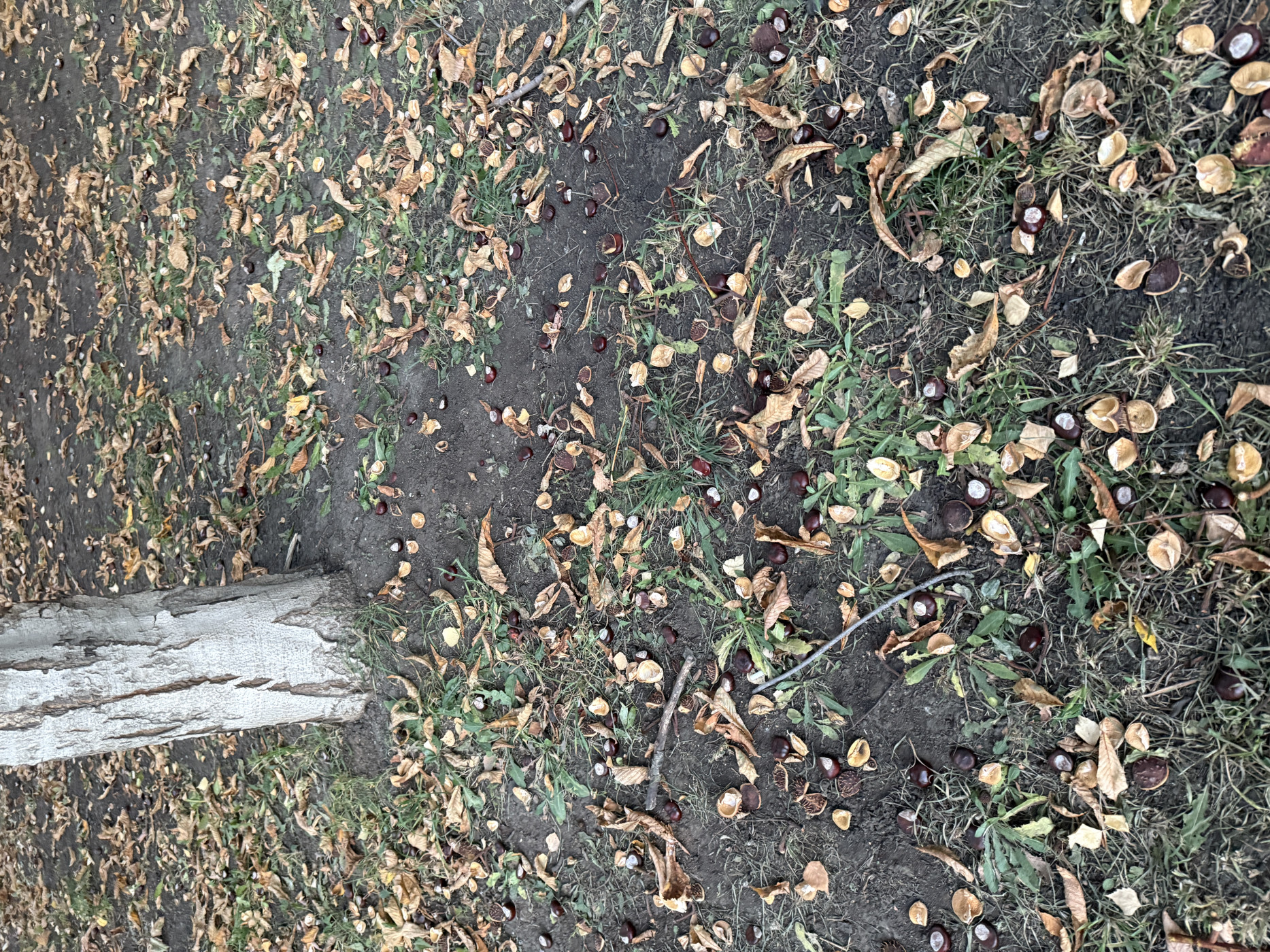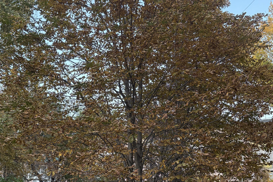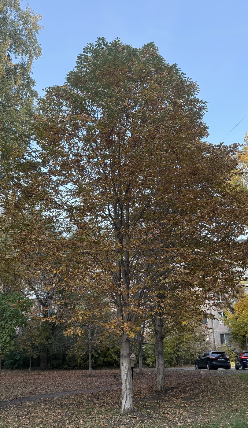 Городской сквер. Примечательно, что это дерево самое зеленое из 5 каштанов в одном ряду. Очень много плодов на земле.