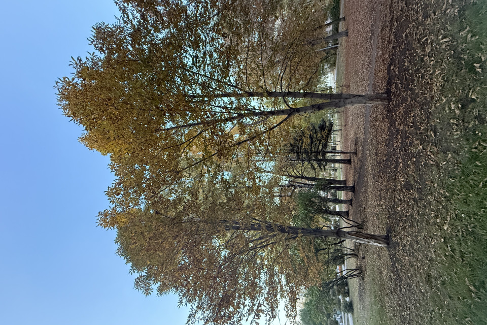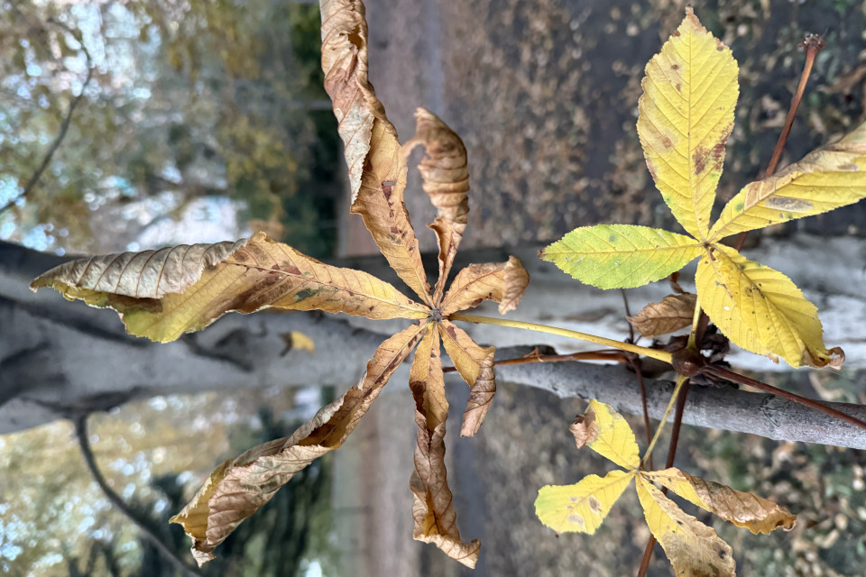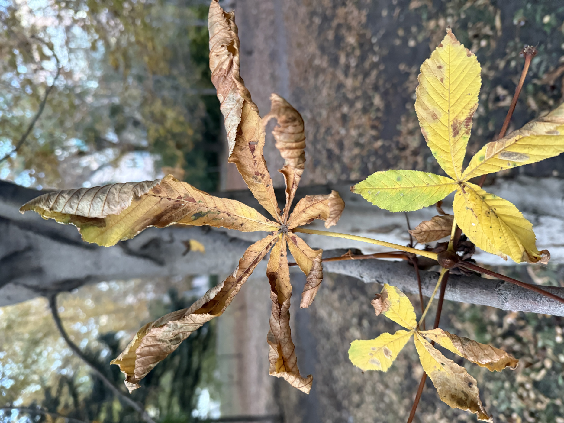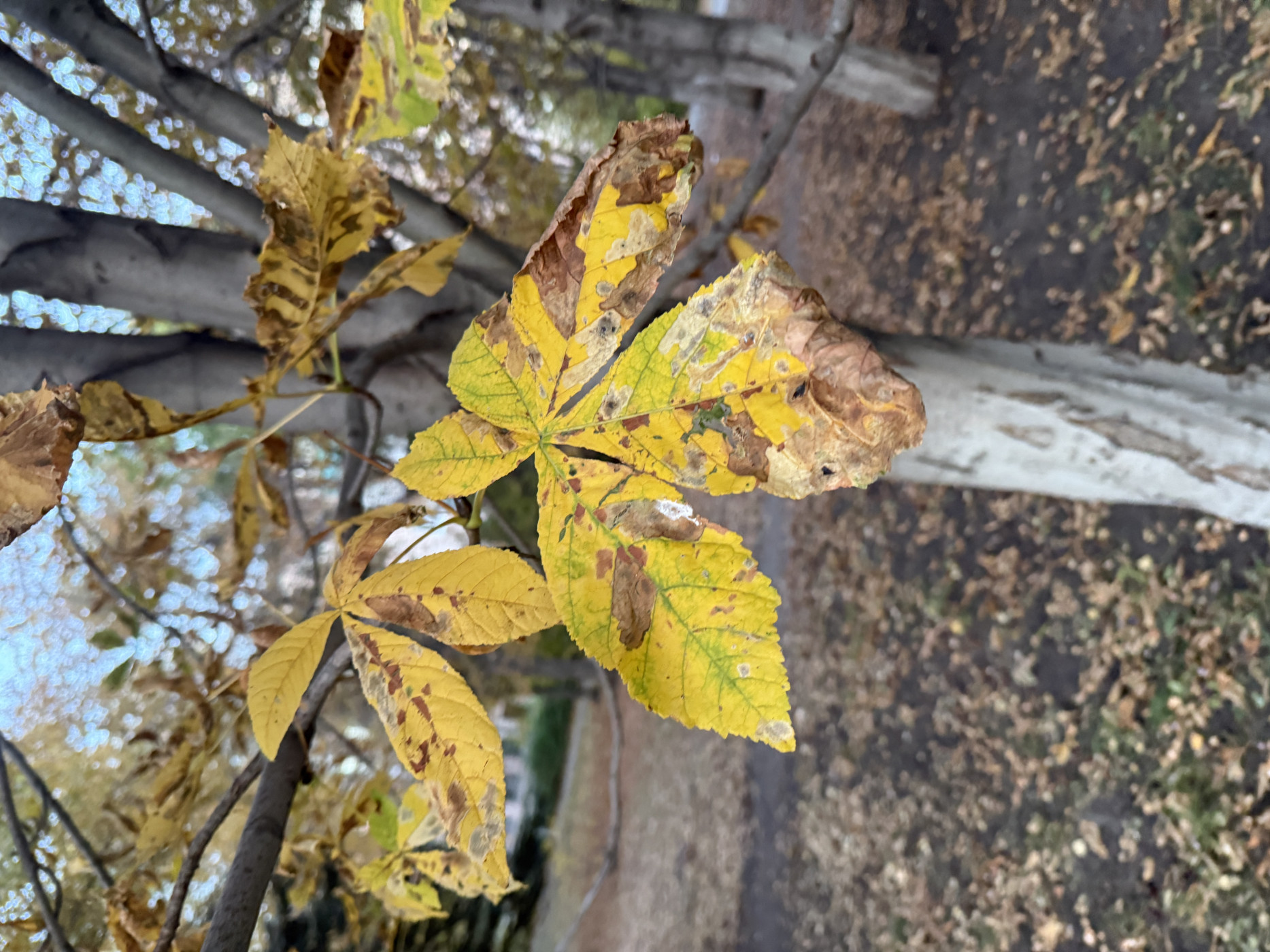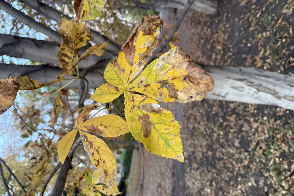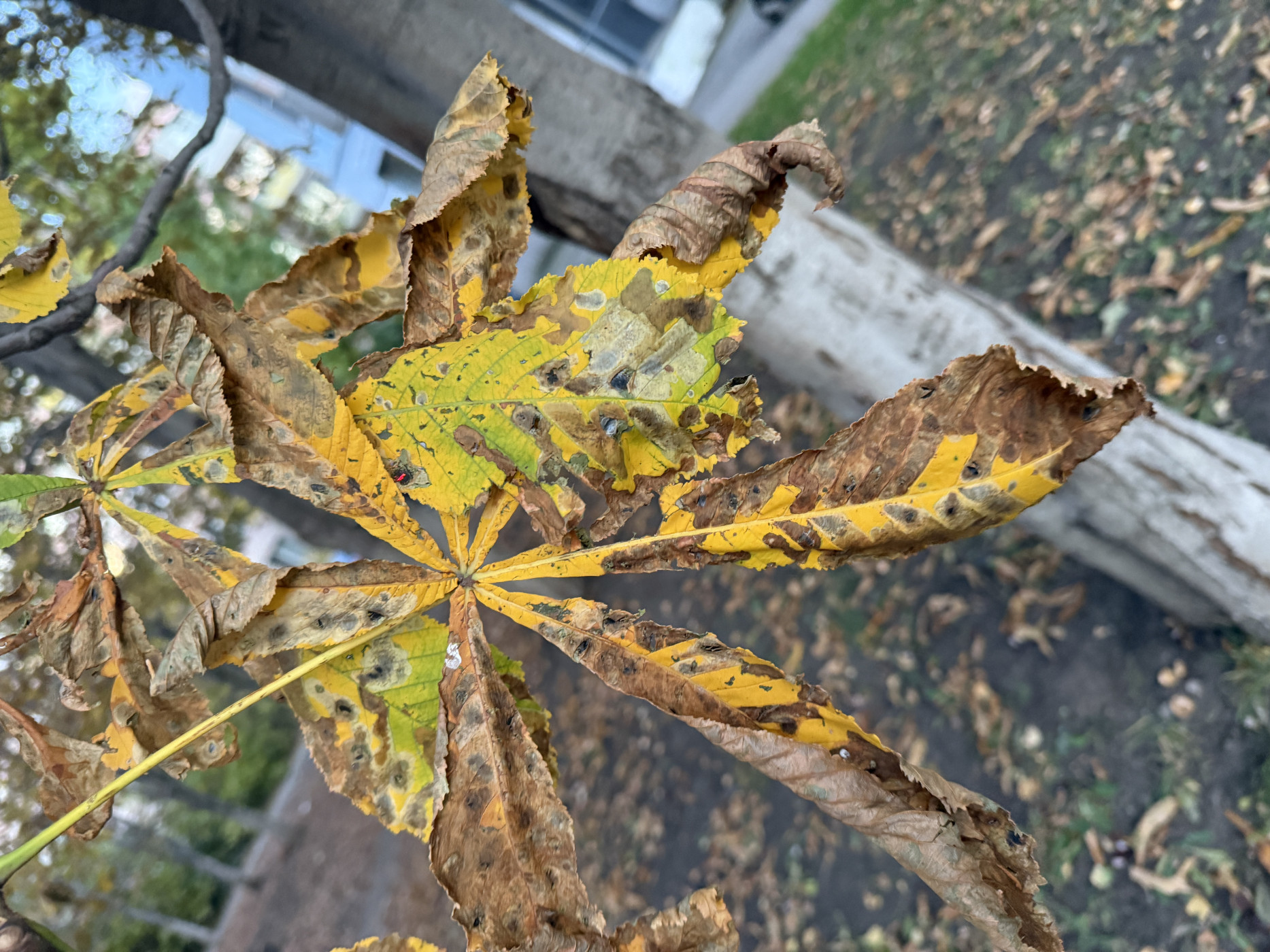 Городской сквер. Примечательно, что это дерево самое зеленое из 5 каштанов в одном ряду. Очень много плодов на земле.